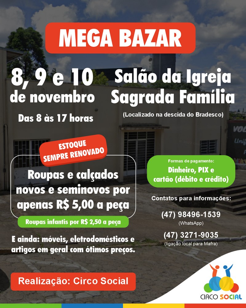 Está programado para os próximos dias 08, 09 e 10 de novembro (sexta, sábado e domingo), das 8h à s 17h, o Mega Bazar Beneficente do Circo Social, a ser realizado no salão da Igreja Sagrada FamÃlia, situado na descida do Bradesco em Mafra.