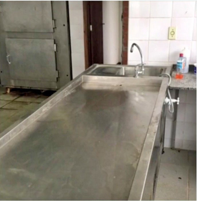 – Mesa para necropsia em estado precário de conservação, sendo utilizado madeiras e tijolo para calçá-la com objetivo de elevá-la e aparelhá-la, pois um dos pés estava quebrado em razão da oxidação