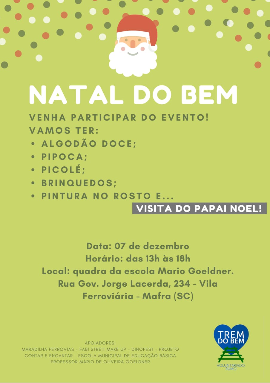 O projeto “Trem do Bem – Voluntariado Rumo” realizará no sábado (dia 07), das 13h às 18h, na quadra da escola Mario Goeldner, em Mafra, o evento voluntário Natal do Bem aberto à comunidade. Terá algodão doce, pipoca, picolé, brinquedos, pintura no rosto e a visita do Papai Noel. Prestigie com a sua família.