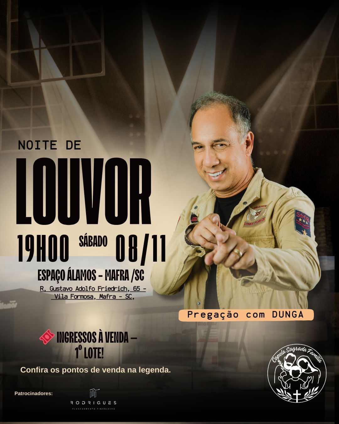 Os ingressos do primeiro lote ao custo de R$ 50,00 já estão à venda, e os pontos de venda podem ser conferidos nas secretarias das igrejas oficial do evento. A Capela Sagrada Família, organizadora local, convida toda a comunidade para viver esse momento de espiritualidade e encontro com Deus.