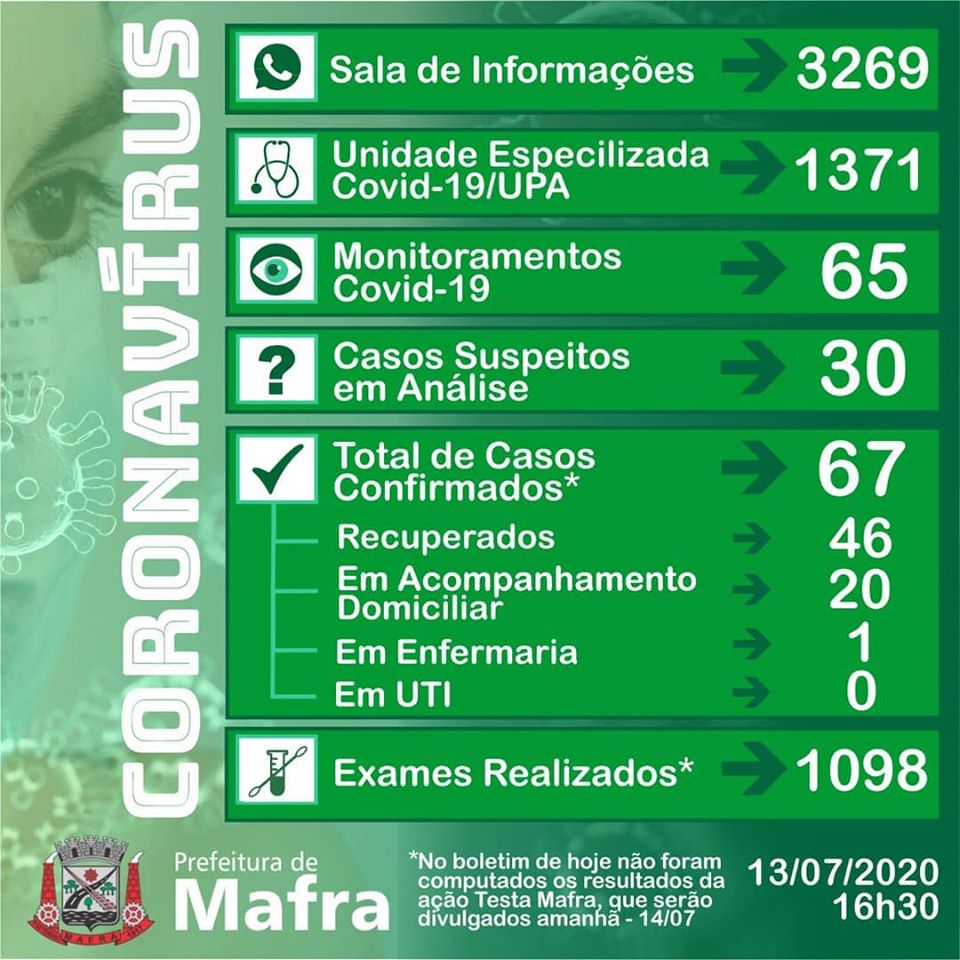 No boletim de Mafra divulgado nesta segunda-feira não constam os resultados os testes rápidos de Covid-19 realizados no último final de semana. Os resultados serão divulgados nesta terça-feira, segundo a prefeitura. Um novo caso foi confirmado nesta segunda-feira. Trata-se de um paciente com 36 anos de idade, sexo masculino. Ele está internado em enfermaria.
