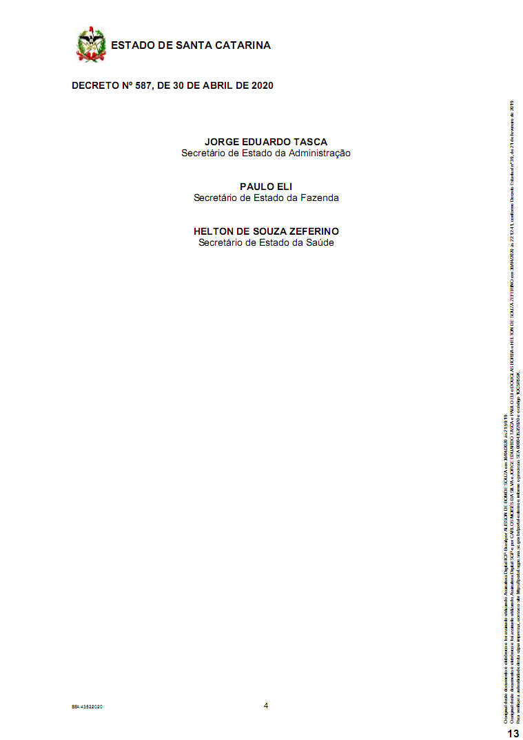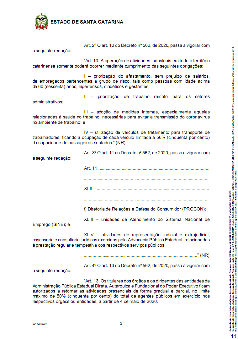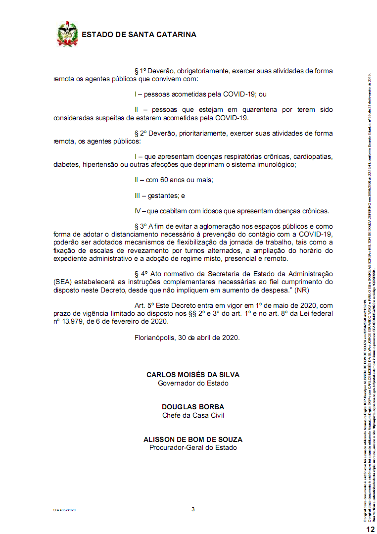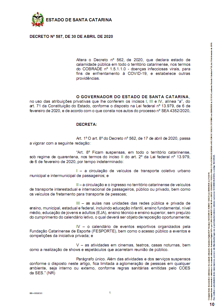 O Estado de Santa Catarina divulgou a edição do Decreto que prorroga por tempo indeterminado a proibição da circulação do transporte coletivo, das aulas presenciais e dos eventos, inclusive os esportivos. As medidas fazem parte da prevenção à transmissão do novo coronavÃrus. Leia na Ãntegra o Decreto: