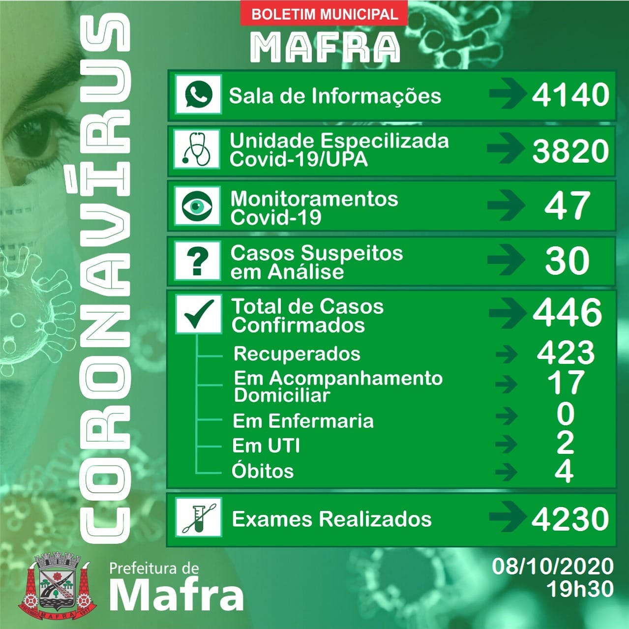 A cidade de Mafra registrou onze novos casos de Covid-19 nesta quinta-feira (08). Dos 446 casos confirmados, 423 pessoas estão recuperadas. Confira o boletim: