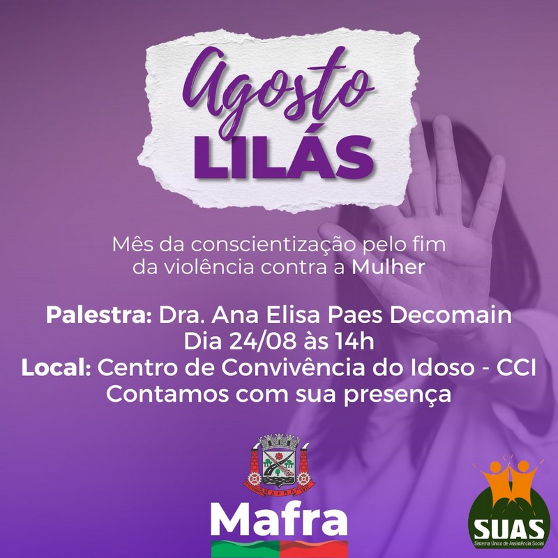 A Prefeitura Municipal de Mafra realizará por meio da Secretaria Municipal de Assistência Social e Habitação, no dia 24 de agosto, palestra alusiva ao “Agosto Lilás”, movimento de conscientização pelo fim da violência contra a mulher. A palestra será proferida pela Dra. Ana Elisa Paes Decomain, no Centro de Convivência do Idoso – CCI, às 14 horas. A participação é livre e todas as mulheres estão convidadas a participar.