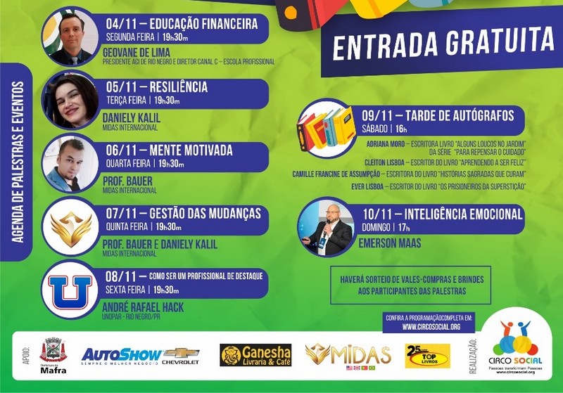 Hoje terá palestra às 19h30 com o tema “Mente motivada”, ministrada pelo Professor Bauer da empresa Midas Internacional. A entrada é gratuita e terá sorteios de vale compras. Compareça! A Feira Cultural será a semana toda, até domingo, das 09h às 22h, no salão da Igreja Nossa Senhora Aparecida de Mafra.