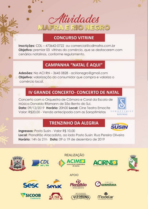 Outra novidade desse Natal é o trenzinho da alegria, uma ação da CDL e ACIM, Sicoob Credinorte e Planaltão Atacadista, com passeios que acontecerão dos dias 9 a 19 de dezembro, das 14 às 21 horas, com ingressos vendidos no Posto Susin. O comércio poderá participar do Concurso Vitrine, cujo objetivo é premiar as 3 vitrines que mais se destacarem. Inscrições pelo e-mail: comercial@cdlmafra.com.br.