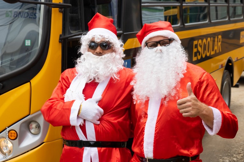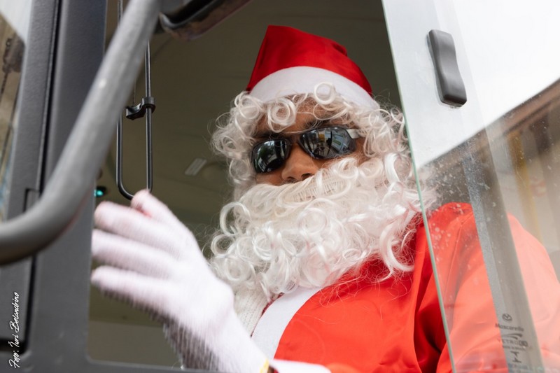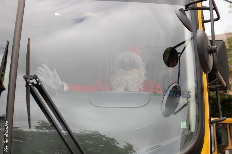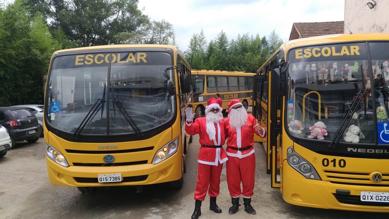 Papai Noel larga o trenó e dirige ônibus escolar em Mafra