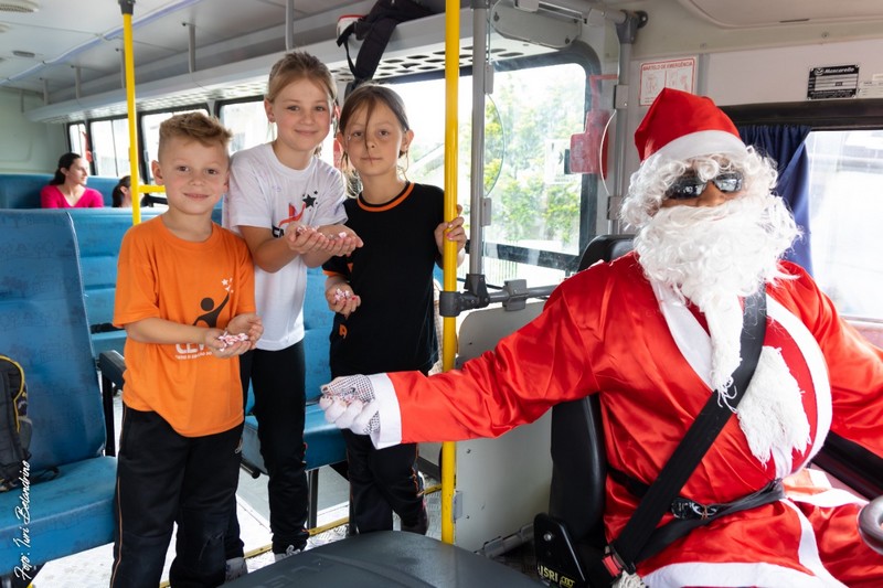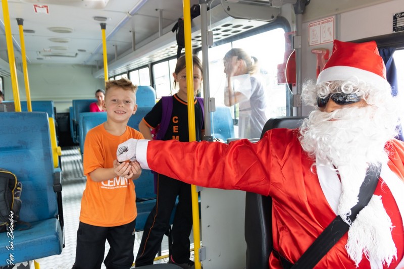 Quando os ônibus chegaram próximos à escola CEMMA, fazendo alarde com a buzina, os alunos já estavam esperando e não acreditaram quando viram o Papai Noel no volante. Com os olhinhos brilhando, todos riam e corriam para entrar nos veículos.  Todos queriam fotos ou selfies com o bom velhinho.