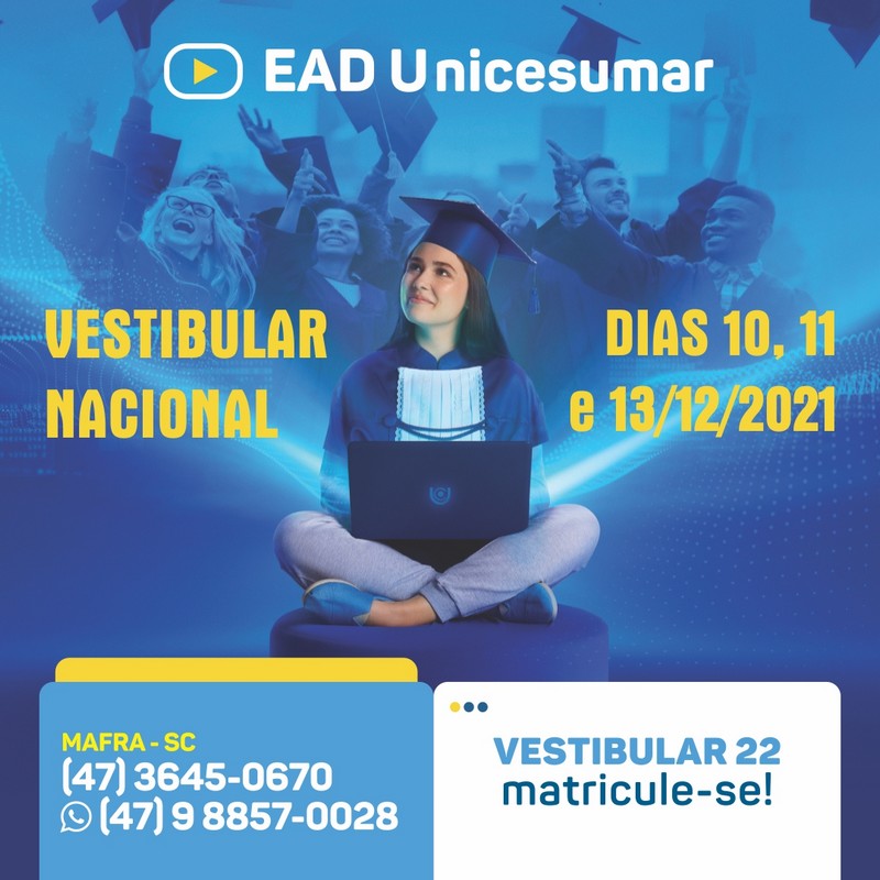 Participe do Vestibular Nacional da Unicesumar. O polo em Mafra fica localizado na Rua Marechal Floriano Peixoto, nº 1355. Para se inscrever basta entrar em contato: (47) 3645-0670 ou (47) 98857-0028.
