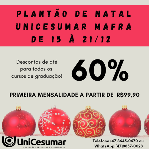 O plantão de Natal da Unicesumar Mafra será de 15 a 21 de dezembro. Aproveite e tenha descontos de até 60% para todos os cursos de graduação.
