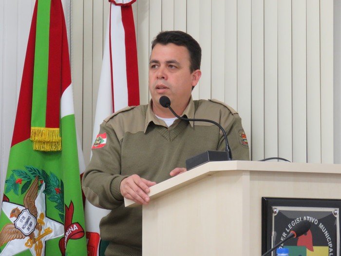 O major Marcelo iniciou a fala agradecendo o espaço concedido da Câmara de Vereadores de Mafra e afirmou que é uma oportunidade de informar a comunidade mafrense sobre os atos da Polícia Militar.