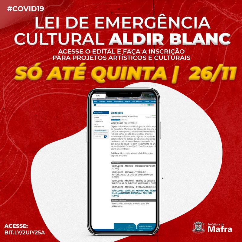 Permanecem abertas até quinta-feira, 26 de novembro, as inscrições para inciso III da Lei Aldir Blanc, para credenciamento de projetos artÃsticos e culturais. Elas devem ser feitas até as 17 horas, devendo os projetos ser entregues/protocolados em envelope identificado no Departamento da Cultura de Mafra, localizado na Av. Cel. José Severiano Maia, n° 117.