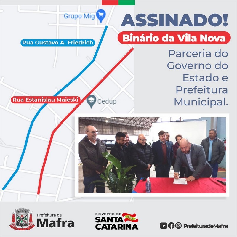 Na solenidade, o prefeito assinou o ato de início da obra, acompanhado do representante da empresa Paviplan, tendo os vereadores como testemunhas. O binário da Vila Nova terá o custo de R$ 3.541.202,81, compreendendo as ruas Ruas Estanislau Maieski e Gustavo Adolfo Friedrich, que receberão melhorias de pavimentação.
