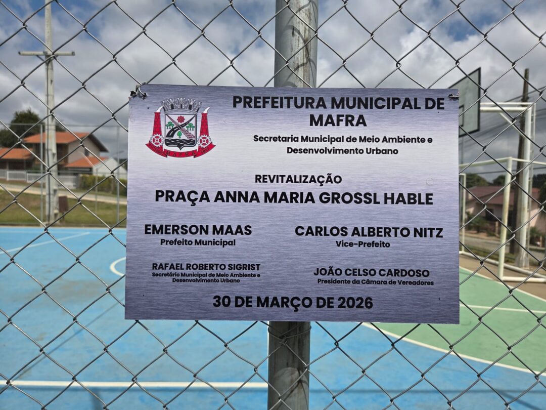 A Prefeitura de Mafra realizou na manhã desta quinta-feira, 2 de abril, a inauguração da revitalização da Praça Anna Maria Grossl Hable, localizada na Vila Nova ( Vila Foit 1), em mais uma ação voltada à melhoria da infraestrutura urbana e qualidade de vida da população, agora com espaço propício para o lazer.