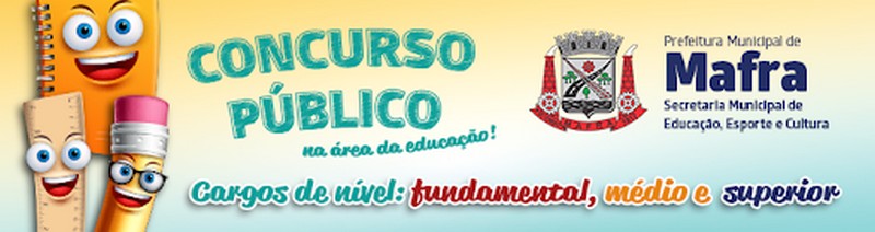 O Edital do Concurso Público e demais comunicados e avisos aos candidatos estão disponÃveis no site do Concurso Público: mafraeduca.fepese.org.br. O edital também está disponÃvel no site da Prefeitura de Mafra, link Transparência/Concurso e Processo Seletivo (www.mafra.sc.gov.br) e no Diário Oficial dos MunicÃpios de Santa Catarina (www.diariomunicipal.sc.gov.br).
