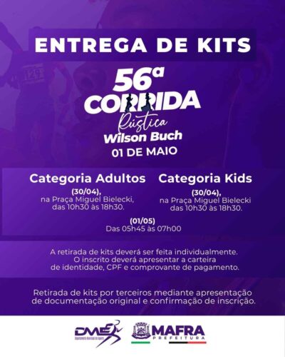 A Prefeitura de Mafra, por meio do Departamento Municipal de Esportes (DME), realiza nos dias 30 de abril e 1º de maio a entrega dos kits para os participantes da 56ª Corrida Rústica Wilson Buch, tradicional evento esportivo do municÃpio.