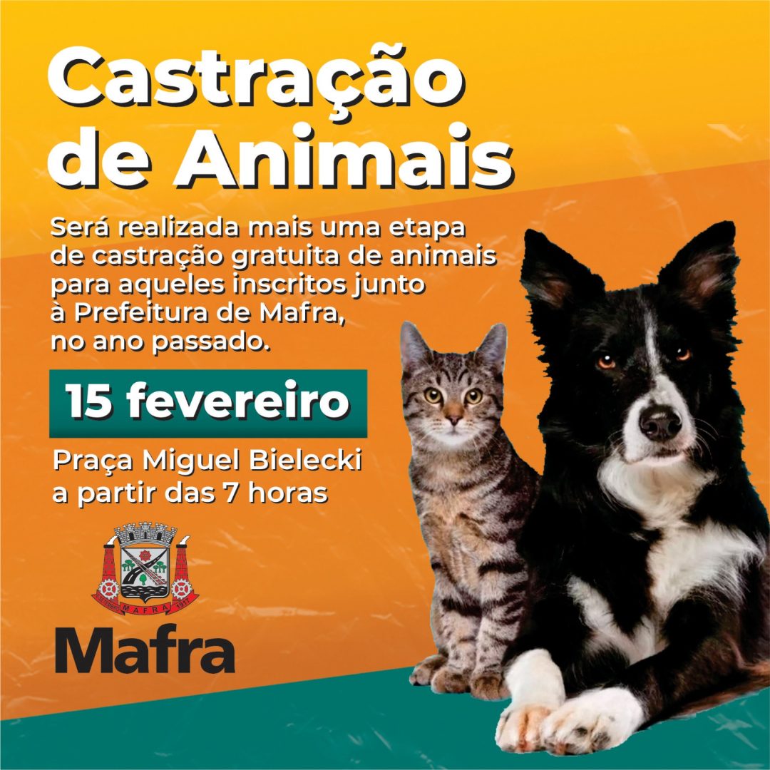 Está programada para o dia 15 de fevereiro, na Praça Miguel Bielecki, mais uma ação de castração gratuita de animais para aqueles já tinham sido inscritos junto à Prefeitura de Mafra,  no ano passado.  O inÃcio está previsto para à s 7 horas.