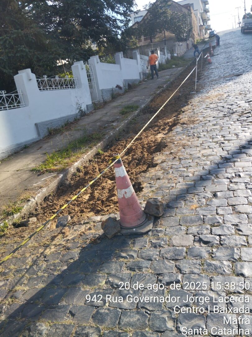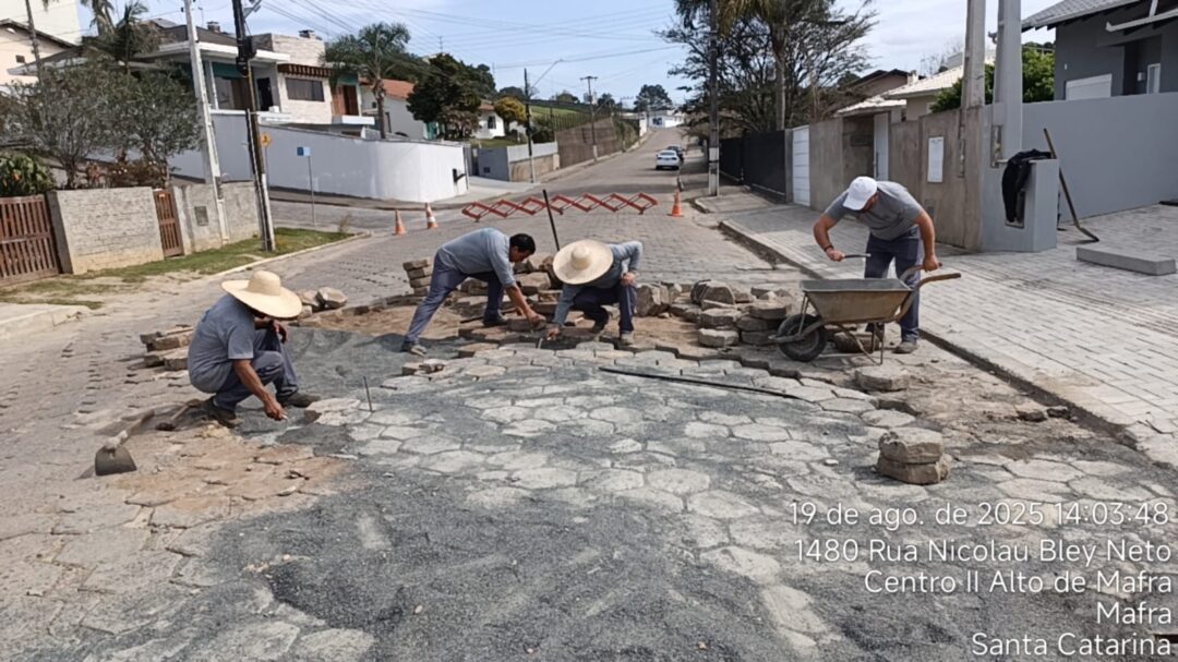 – Manutenção nas lajotas afundadas e elevadas na Rua Nicolau Bley Neto, no Centro II alto de Mafra;