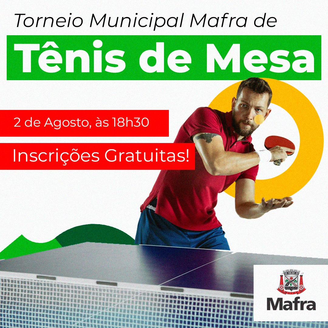 Vem aà o Torneio Municipal Mafra de Tênis de Mesa. Será no dia 2 de agosto, às 18h30, no Ginásio de Esportes Wilson Buch. As inscrições são gratuitas e já estão abertas, podendo ser feitas em dois locais diferentes: na EMEB Mário Goeldner e no Ginásio de Esportes Wilson Buch.