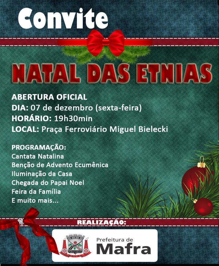Nesta sexta-feira, dia 07 de dezembro às 19h30min será realizada em Mafra a abertura do Natal das Etnias, juntamente com a chegada do Papai Noel. O evento acontecerá na Praça Ferroviário Miguel Bielecki e contará com diversas atrações para todas as famílias Mafrenses e da região.