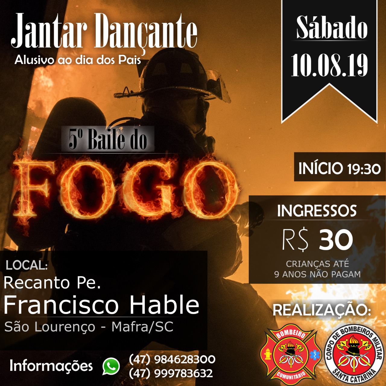 A Associação de Bombeiros Comunitários de Mafra realizará no dia 10 de agosto, a quinta edição do Baile do Fogo com jantar dançante em comemoração ao Dia dos Pais. O evento terá início às 19h30 no Recanto Pe. Francisco Hable. Os ingressos estão à venda ao custo de R$ 30,00 com os Bombeiros Comunitários ou no Corpo de Bombeiros de Mafra. Crianças até 09 anos não pagam.