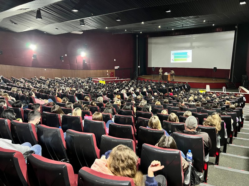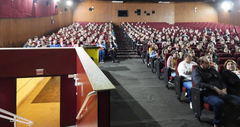Aproveitando as férias escolares, a Secretaria Municipal de Educação reuniu na tarde de segunda-feira, dia 17, cerca de 500 professores da rede municipal de ensino – da Educação Infantil ao Ensino Fundamental I e II – para a segunda formação continuada deste ano. A abertura oficial aconteceu no Cineplus Emacite, onde os presentes ouviram sobre o Protocolo Estadual de Segurança nas escolas, apresentado pelas policiais militares Diana e Juliana. Na sequência foi abordado o tema “Dificuldades de Aprendizagem”, pelo palestrante Antônio da TFD, empresa do sistema de ensino do município.