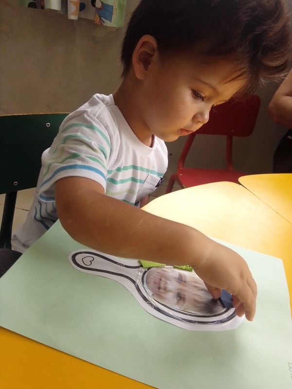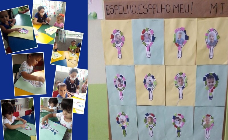 A criatividade das professoras para trabalharem o tema foi o destaque na utilização da história da Branca de Neve e os Sete Anões. A pergunta da bruxa malvada “Espelho, espelho meu…existe alguém mais bela do que eu…” deu um toque especial na aula, com a professora interpretando a frase fantasiada de bruxa. “Foi um momento mágico e as crianças vivenciaram com muita satisfação e curiosidade”, declararam. A atividade apresentada aos alunos foi o desenho de um espelho, em seguida a professora utiliza a caixa surpresa com as fotos dos aluno, em que cada um deveria achar a sua foto e colar no espelho, ficando o acabamento final por conta da criança, trabalhando assim também a coordenação motora fina.