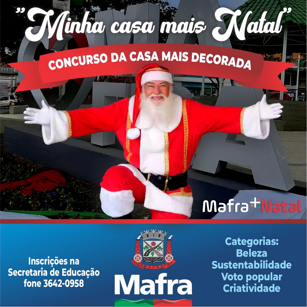 Para deixar Mafra preparada para o Natal, o Município está convidando a população para enfeitar suas residências e participar do concurso “Minha casa mais Natal”. Elas serão avaliadas pelos quesitos beleza, sustentabilidade, voto popular e criatividade. As inscrições já podem ser feitas na Secretaria Municipal de Educação. Informações pelo telefone 3642-0958.