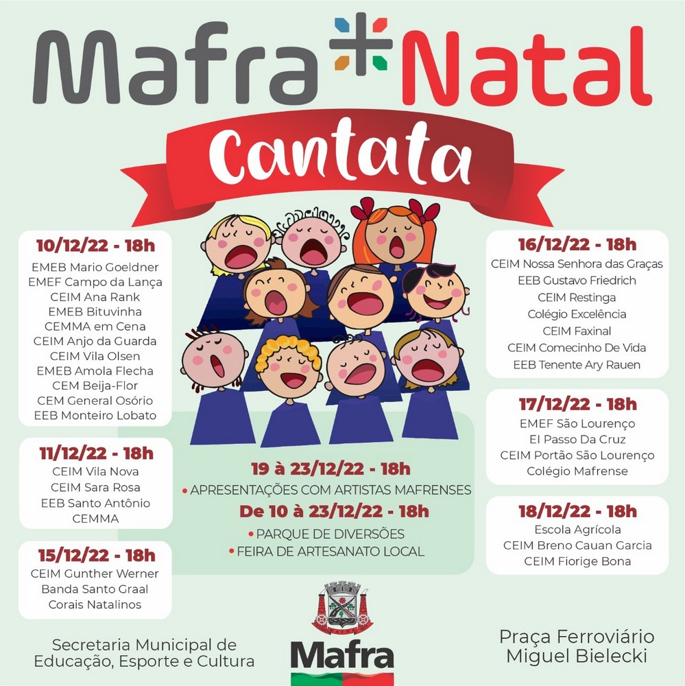 As cantatas “Mafra mais Natal” acontecerão do dia 10 ao dia 18 de dezembro, com a participação dos alunos das escolas municipais, estaduais e particulares, além de corais e bandas locais. Já as apresentações com artistas mafrenses estão programadas para o período de 19 à 23 de dezembro, sempre com início às 18 horas. No período de 10 a 23 de dezembro, a Praça contará com parque de diversões para as crianças e com a Feira de artesanato local.