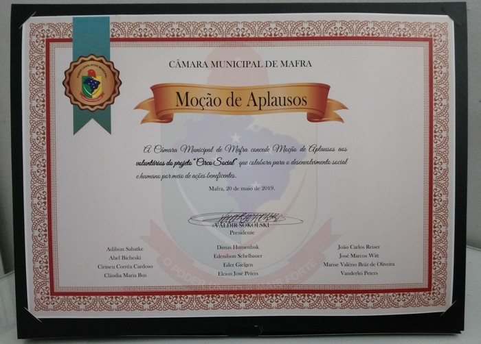 O projeto Circo Social foi homenageado com Moção de Aplausos na noite desta terça-feira na Câmara de Vereadores de Mafra. O certificado foi entregue pelos vereadores aos voluntários do projeto, que colabora para o desenvolvimento social e humano por meio de ações beneficentes em Mafra, Rio Negro e região.