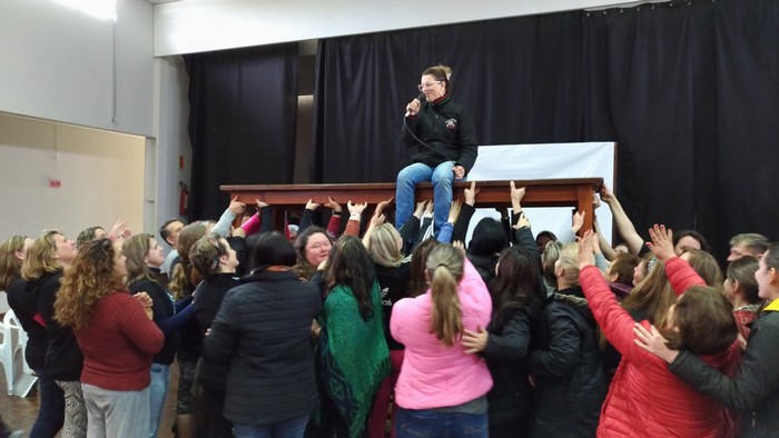 Ao final do encontro a Secretaria Estela Maris Bergamini Machado mostrou – não só falou – da importância da união da equipe para levar a educação do município com resultados positivos, eficiência, força e sabedoria. Como simbologia, ela subiu em uma mesa que foi levantada pela soma das forças de todos.