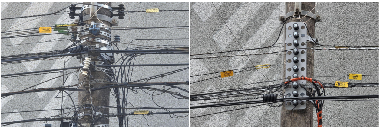 Antes da instalação, as equipes fizeram uma limpeza completa da rede, retirando fios antigos, sem uso ou fora dos padrões técnicos. O novo suporte foi preso ao poste e a reorganização da fiação exigiu a remoção temporária de luminárias públicas. A instalação levou cerca de duas horas por poste.