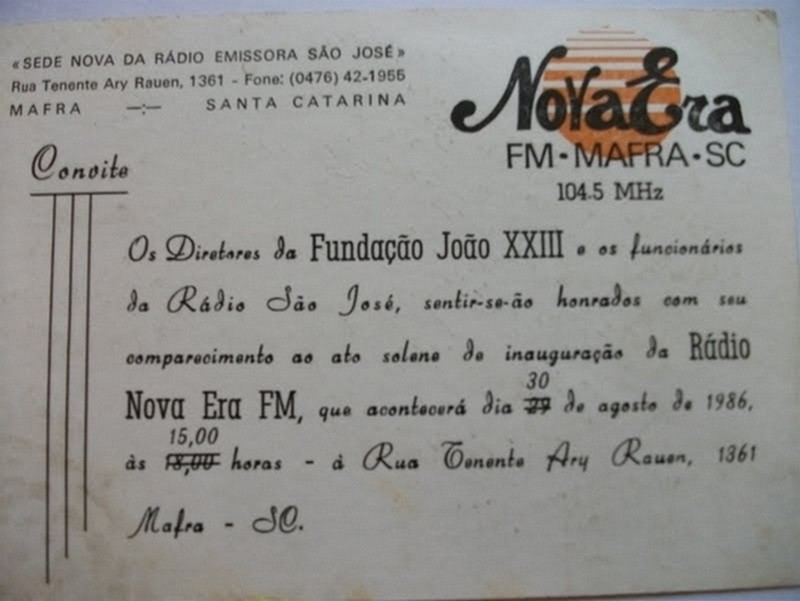 Nesta segunda-feira (30) a rádio Nova Era FM comemora 35 anos de atividades. Fundada em 1986 na cidade de Mafra, a emissora vem constantemente se modernizando. Os trabalhos foram iniciados com um transmissor de 250 watts, abrangendo somente parte da cidade. Em 30 de agosto de 1990 a potência do transmissor foi aumentada para 1.000 watts. Esta potência foi aumentada novamente em 1994, quando a rádio passou a operar com 10.000 watts. No último ano houve a conquista de mais um aumento de potência, passando para 15.000 watts. Desta forma, a Nova Era FM tornou-se a rádio com maior potência no planalto norte de Santa Catarina, com uma abrangência que chega a aproximadamente 25 cidades do estado, bem como parte do Paraná. Além disso, a rádio utiliza a internet e aplicativos para celulares para que pessoas do mundo a sintonizem de qualquer lugar.