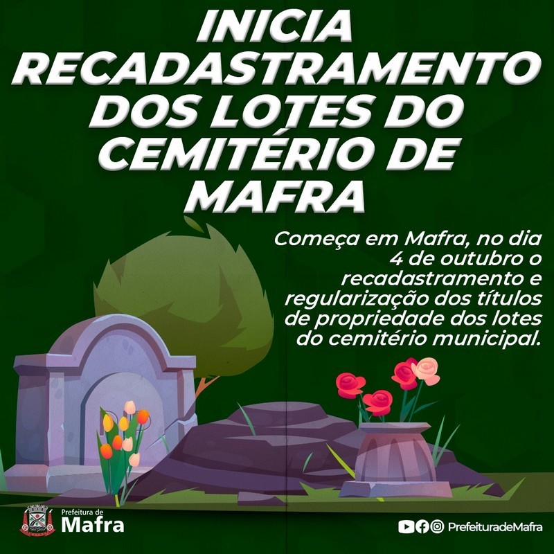 Começa em Mafra, no dia 4 de outubro o recadastramento e regularização dos títulos de propriedade dos lotes do cemitério municipal. O início será pelas quadras 11 e 12 e deverá ser feito pelos titulares, herdeiros ou sucessores de títulos dessas quadras.