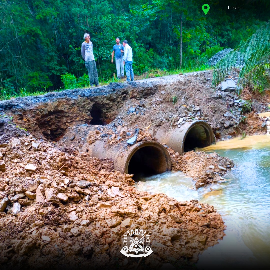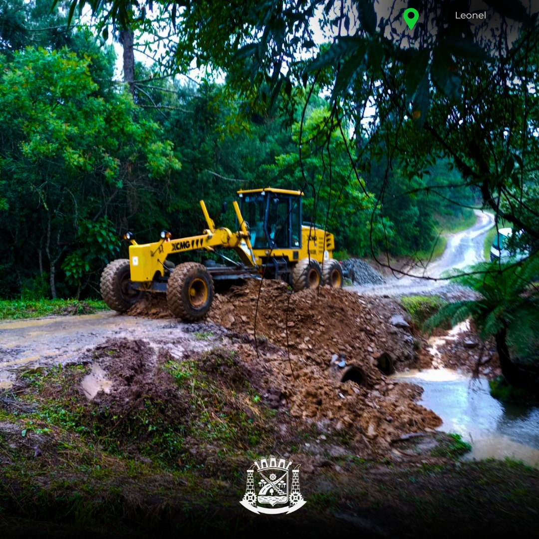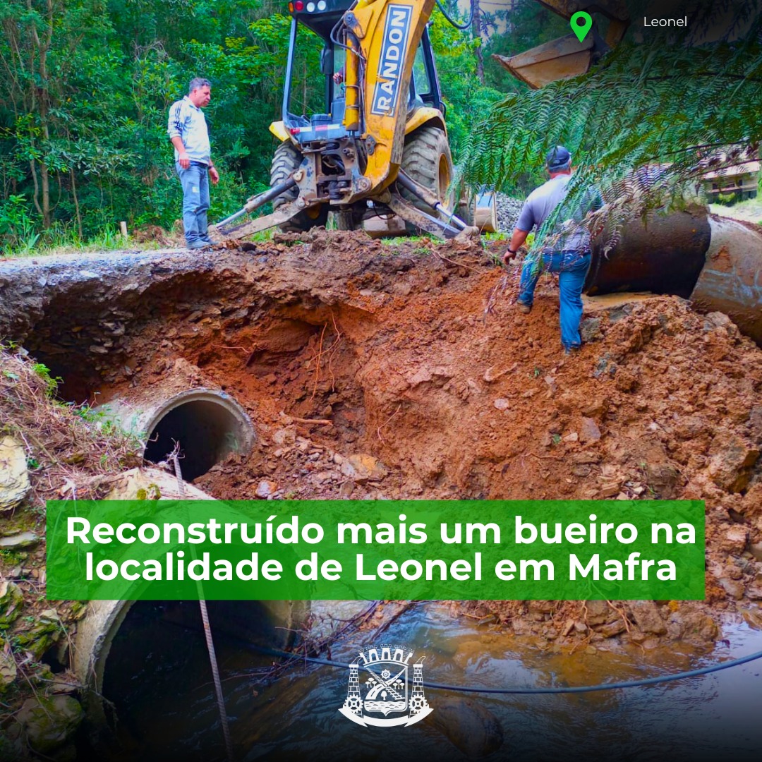 Mais um bueiro foi reconstruÃdo nesta semana, no interior de Mafra. Desta vez a comunidade atendida foi a de Leonel, onde as chuvas causaram estragos no bueiro e erosão na estrada local. Lá foram realizados serviços de aterro e empedramento, normalizando as condições de tráfego.