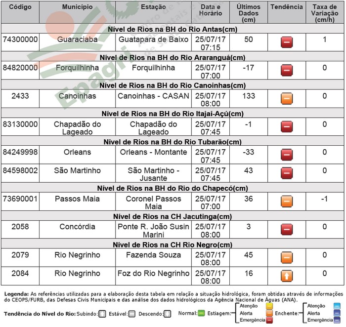 De acordo com a previsão da Epagri/Ciram, o tempo deve permanecer seco no estado até a próxima semana, com chuva prevista apenas a partir do dia 2 de agosto. Isso pode reduzir ainda mais os níveis dos rios e gerar problemas de abastecimento de água de algumas localidades. Conforme mostra a tabela a seguir, também há rios em estado de alerta: Canoinhas, Passos Maia e Rio Negrinho.