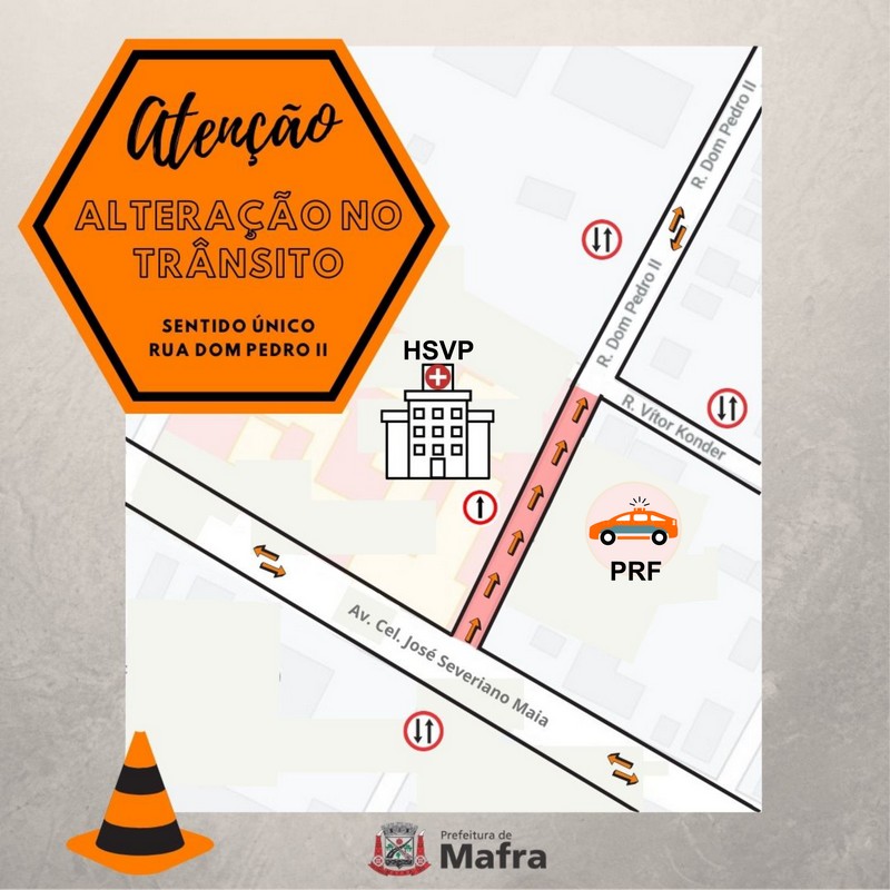 O Departamento de Trânsito da Prefeitura de Mafra informa que a Rua Dom Pedro II, nos fundos do Hospital São Vicente de Paulo, passará a ser mão única entre a Avenida Coronel José Severiano Maia e a Rua Vitor Konder, com o objetivo de otimizar o acesso de ambulâncias, bem como de veÃculos com pacientes.