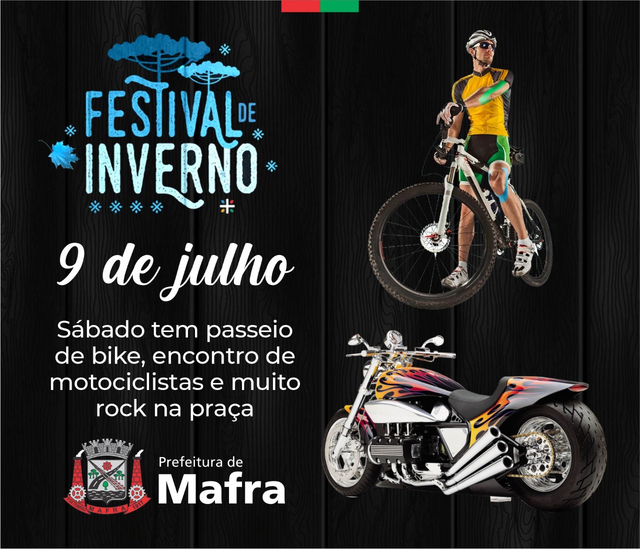 Se você quer passar um dia de lazer, encontrar os amigos, se exercitar pedalando 30 km por belas paisagens do interior e ainda curtir muito rock and roll, vá para a praça neste sábado, dia 9 e participe do Festival de Inverno de Mafra. As atividades começam às 8 horas, com o passeio de Cicloturismo e a partir das 11 horas acontece o encontro de Motociclistas.