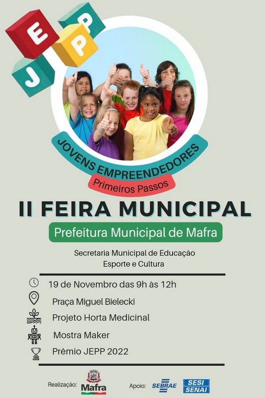 Escolas municipais e estaduais do Ensino Fundamental de Mafra fazem parceria para demonstrar as habilidades despertadas na área do empreendedorismo e realizam neste sábado, dia 19 de novembro, das 9 às 12 horas, na Praça Ferroviário Miguel Bielecki, a II Feira Municipal Jovens Empreendedores  Primeiros Passos – JEPP.