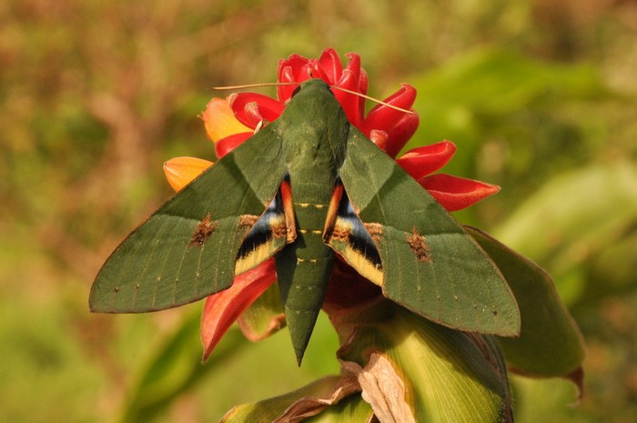 O Click Riomafra conversou com o biólogo riomafrense Sandro Lemos, que esclareceu a dúvida: “O vídeo mostra uma lagarta jovem que é conhecida popularmente como Lagarta Serpente. Ela vai ficar mais parecida ainda com uma serpente. É inofensiva! E vai se transformar nessa mariposa verde linda também (foto abaixo). O nome científico é Eumorpha labruscae, da família Sphingidae”.