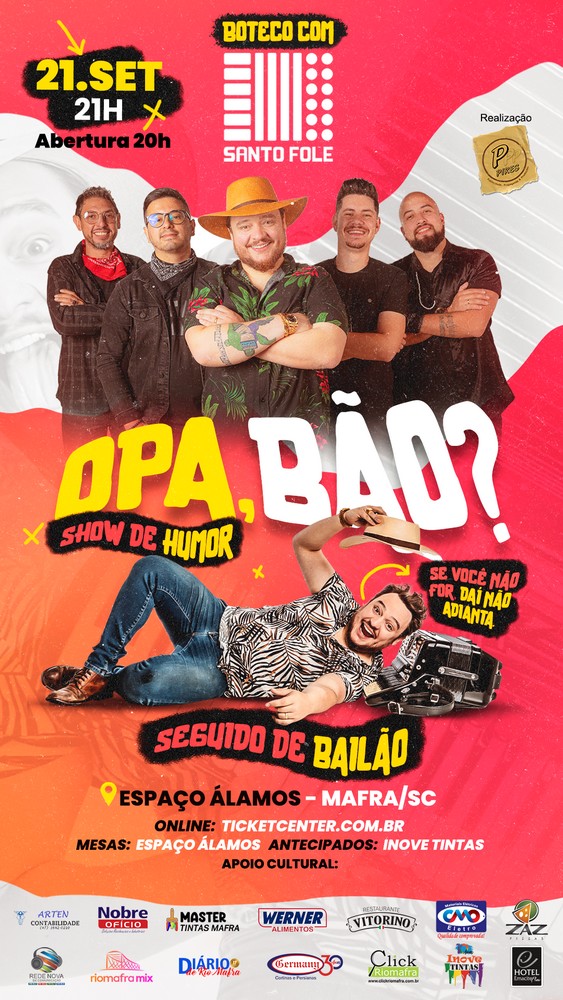 A noite inicia com o show de humor e segue o baile! Um evento que vai te fazer rir e dançar até não aguentar mais. Você terá a oportunidade de se divertir com o humor único e versátil do Santo Fole e curtir uma boa música, em um único show. Conhecido pelas suas dublagens engraçadas que viralizaram nas redes sociais, ele conquistou mais de um milhão de seguidores no Instagram.