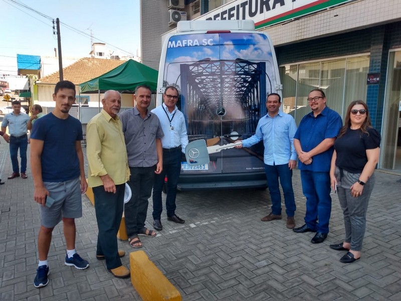 A Prefeitura de Mafra adquiriu um novo veículo que vai auxiliar nas ações e atividades relacionadas à Secretaria de Saúde no que tange ao transporte e tratamento de pacientes fora de domicílio, bem como transferência de pacientes. O veículo é uma Van com capacidade de transporte de 15 passageiros, modelo MB Sprinter 415 CDI, zero km, adquirido com recursos do Fundo Municipal de Saúde, no valor de R$ 182.500,00, através de processo licitatório – Pregão RP nº 140/2018 – Processo nº 591/2018. Vale destacar que em abril de 2019 a Saúde adquiriu por meio deste mesmo processo licitatório um Furgão Ambulância – com capacidade para ser adaptada como UTI Móvel -, MB Sprinter, zero km, no valor de R$ 190 mil. A entrega oficial aconteceu na tarde da última quinta-feira, 12, em frente ao prédio da Prefeitura, com a presença do prefeito Wellington Bielecki, dos vereadores Éder Gielgen (presidente da Câmara Municipal), Adilson Sabatke e Valdir Sokolski, dos secretários municipais da Saúde, Jaqueline Fátima Previatti Veiga e de Administração, Alexandre Solesinki, e de demais convidados e servidores municipais.