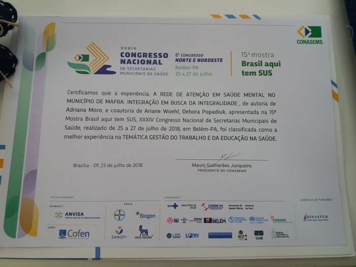 Mais do que receber um certificado ou uma medalha, o reconhecimento do trabalhado foi o principal motivo de satisfação para os profissionais da Secretaria de Saúde de Mafra que compareceram ao 34º Congresso Nacional de Secretarias Municipais de Saúde e 6º Congresso Norte e Nordeste, realizados em Belém-PA, de 25 a 27 de julho. Durante o congresso, aconteceu ainda a 15ª Mostra “Brasil aqui tem SUS”, na qual a Secretaria de Saúde de Mafra ganhou dois prêmios por ações bem-sucedidas no município.