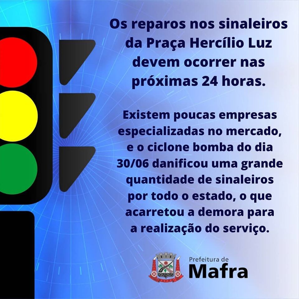 A prefeitura de Mafra divulgou nesta segunda-feira (20) que os reparos nos sinaleiros da Praça HercÃlio Luz, no Centro, devem ocorrer nas próximas 24 horas. Os aparelhos ficaram danificados com o “ciclone bomba” ocorrido no dia 30 de junho.