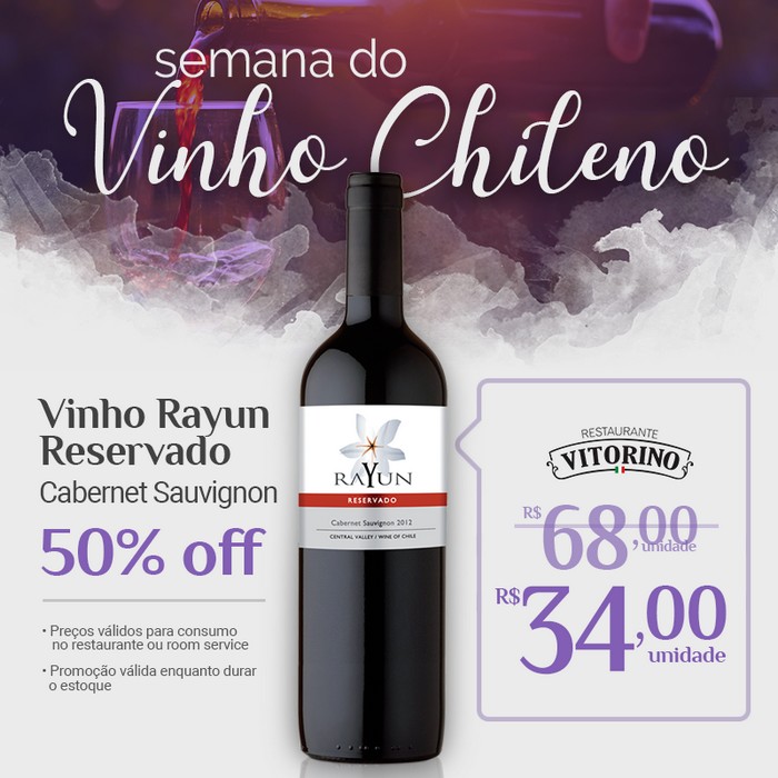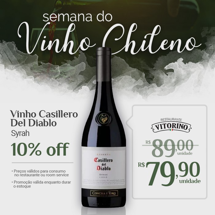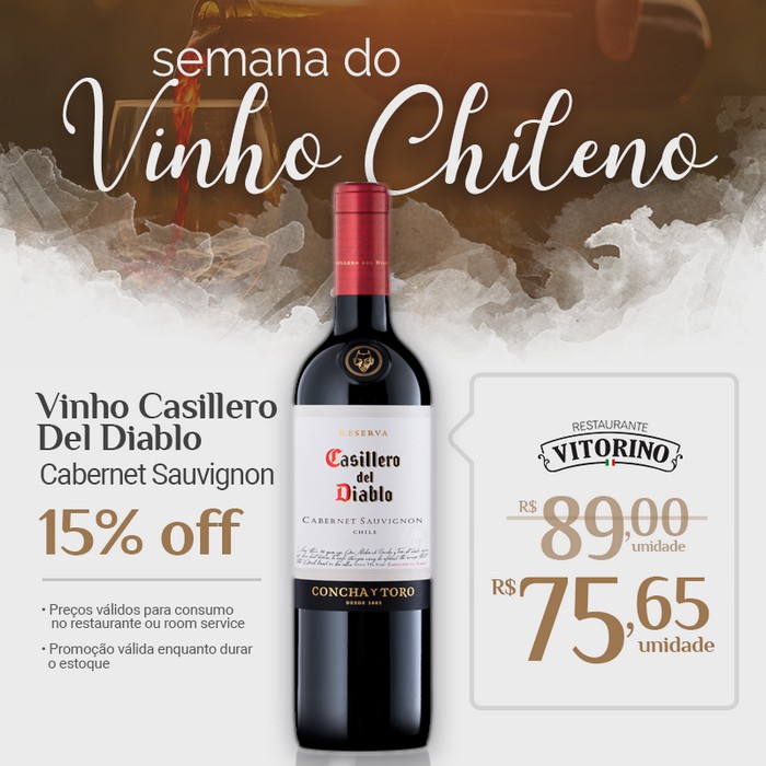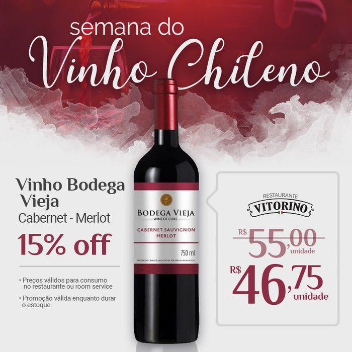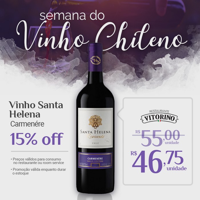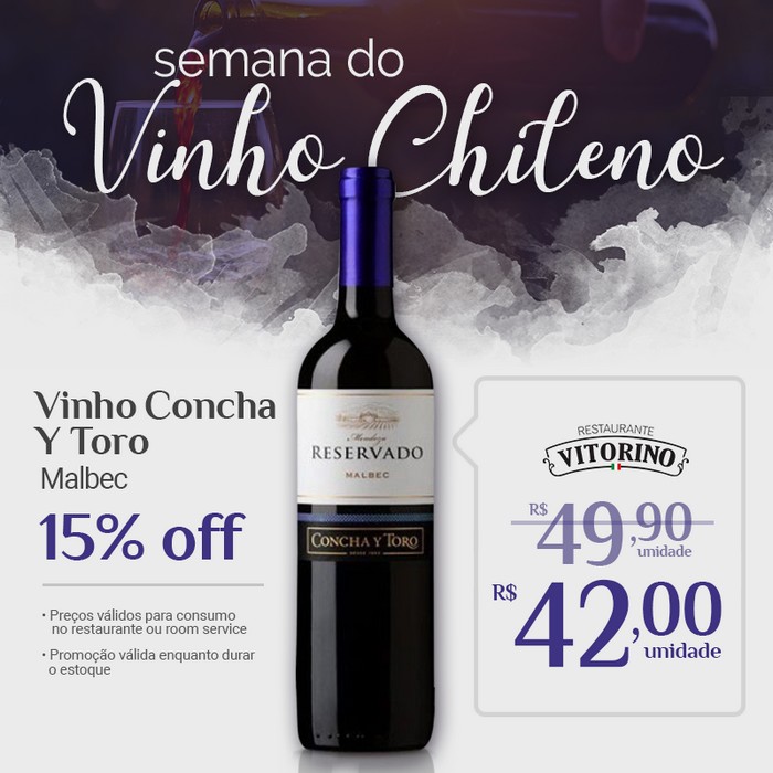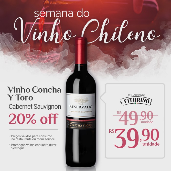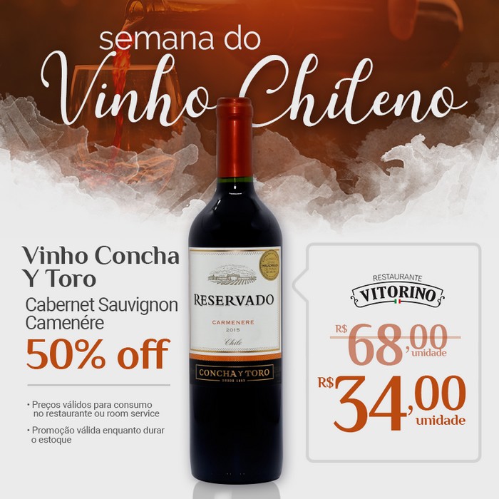 Os vinhos chilenos além do seu sabor marcante, são carregados de história. E do dia 20 a 26 de agosto aqui no Restaurante Vitorino você encontra uma carta especialmente elaborada com rótulos incrÃveis e até 50% de desconto.