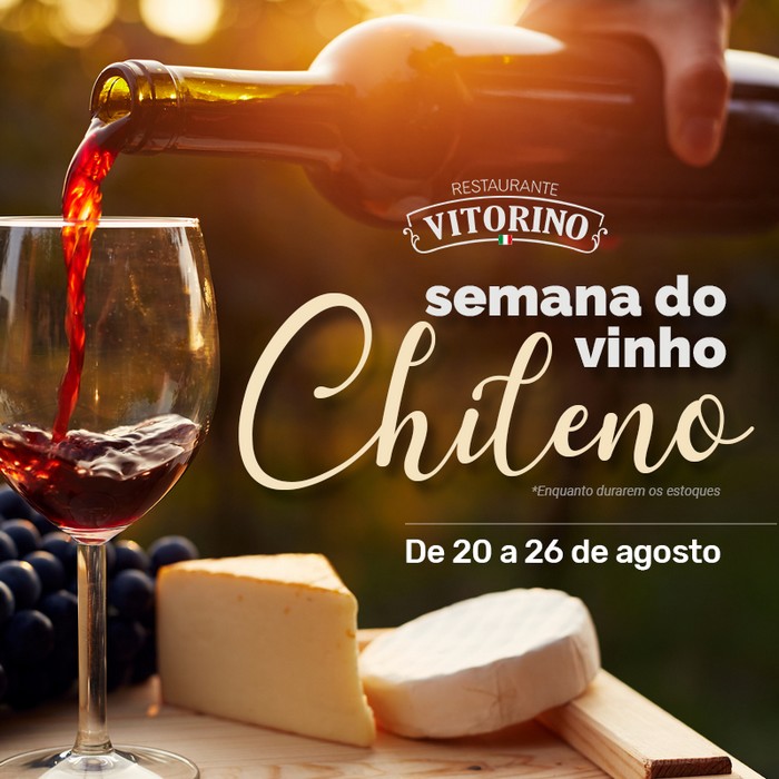 Do dia 20 a 26 de agosto os apreciadores de bons vinhos já sabem onde encontrar os melhores rótulos por um preço incrÃvel. É a semana do vinho chileno aqui no Restaurante Vitorino. Uma seleção especial de bebidas produzidas no Chile com até 50% de desconto.