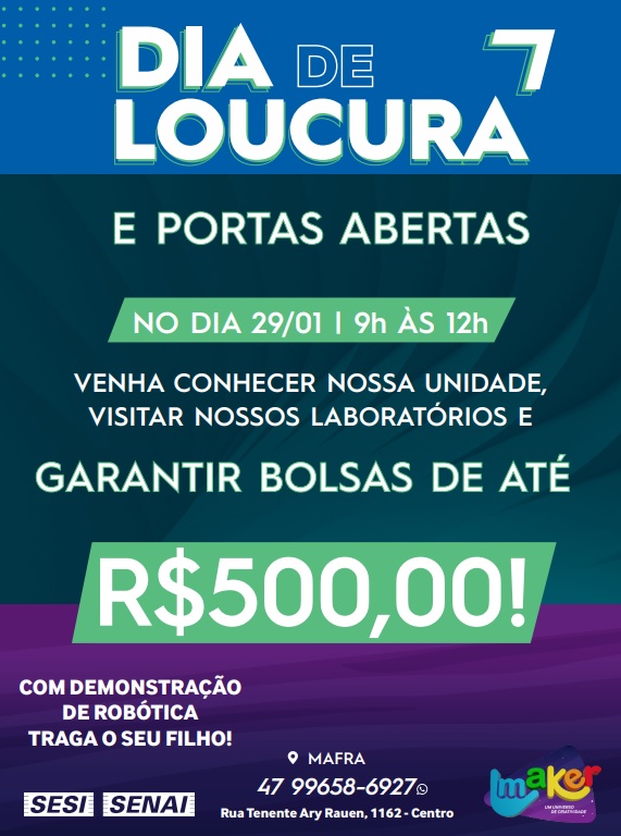 Estudantes e familiares que desejam conhecer a estrutura do Senai têm uma oportunidade neste sábado, 29 de janeiro. A unidade de Mafra abrirá à comunidade das 9 à s 12h. Endereço: Rua Tenente Ary Rauen, 1162 – Centro II Alto de Mafra. Contato: (47) 3641-5913,