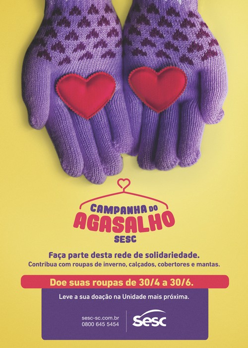 O Sesc em Santa Catarina inicia, no dia 30 de abril, a Campanha do Agasalho 2018 em suas Unidades no Estado. Com o lema “Faça parte desta rede de solidariedade”, convida a sociedade a participar da mobilização, que visa à arrecadação de roupas de inverno, calçados, cobertores e mantas, em bom estado de uso. As doações serão destinadas a instituições sociais e comunidades de baixa renda, identificadas com estas necessidades, e podem ser entregues até 30 de junho nas Unidades Sesc/SC e entidades parceiras.