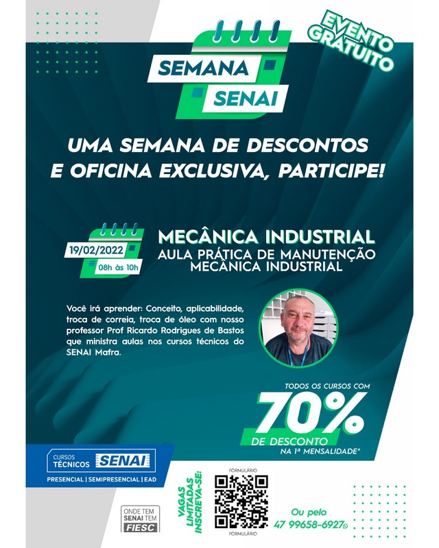 SESI/SENAI de Mafra terá oficina gratuita. Será algo especial voltado para quem tem interesse na área de Mecânica Industrial.