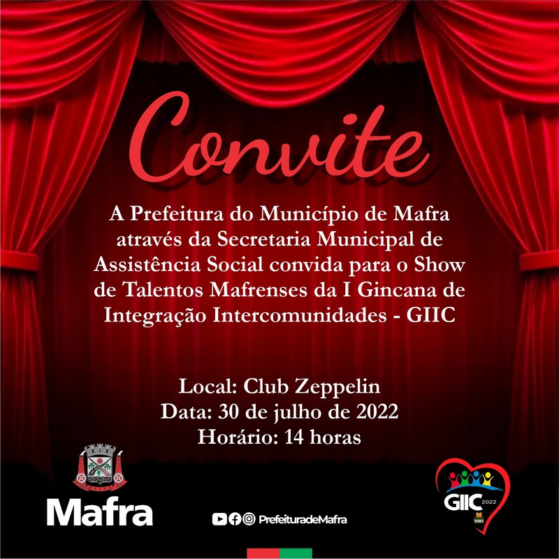 A Prefeitura de Mafra realizará por meio da Secretaria Municipal de Assistência Social, o “Show de Talentos Mafrenses”. O evento acontecerá no dia 30 de julho, a partir das 14 horas, no Clube Zeppelin e faz parte do desafio lançado às Associações de Moradores participantes da I Gincana de Integração Intercomunidades. A entrada é gratuita e toda a população está convidada.